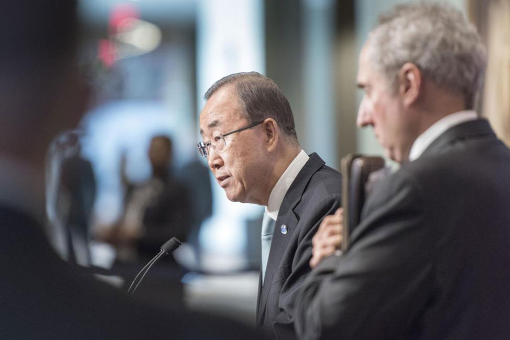 Secretary-General Ban Ki-moon addresses the press at UN Headquarters in New York on the situation in South Sudan. At right is spokesperson Stéphane Dujarric. UN Photo/Mark Garten